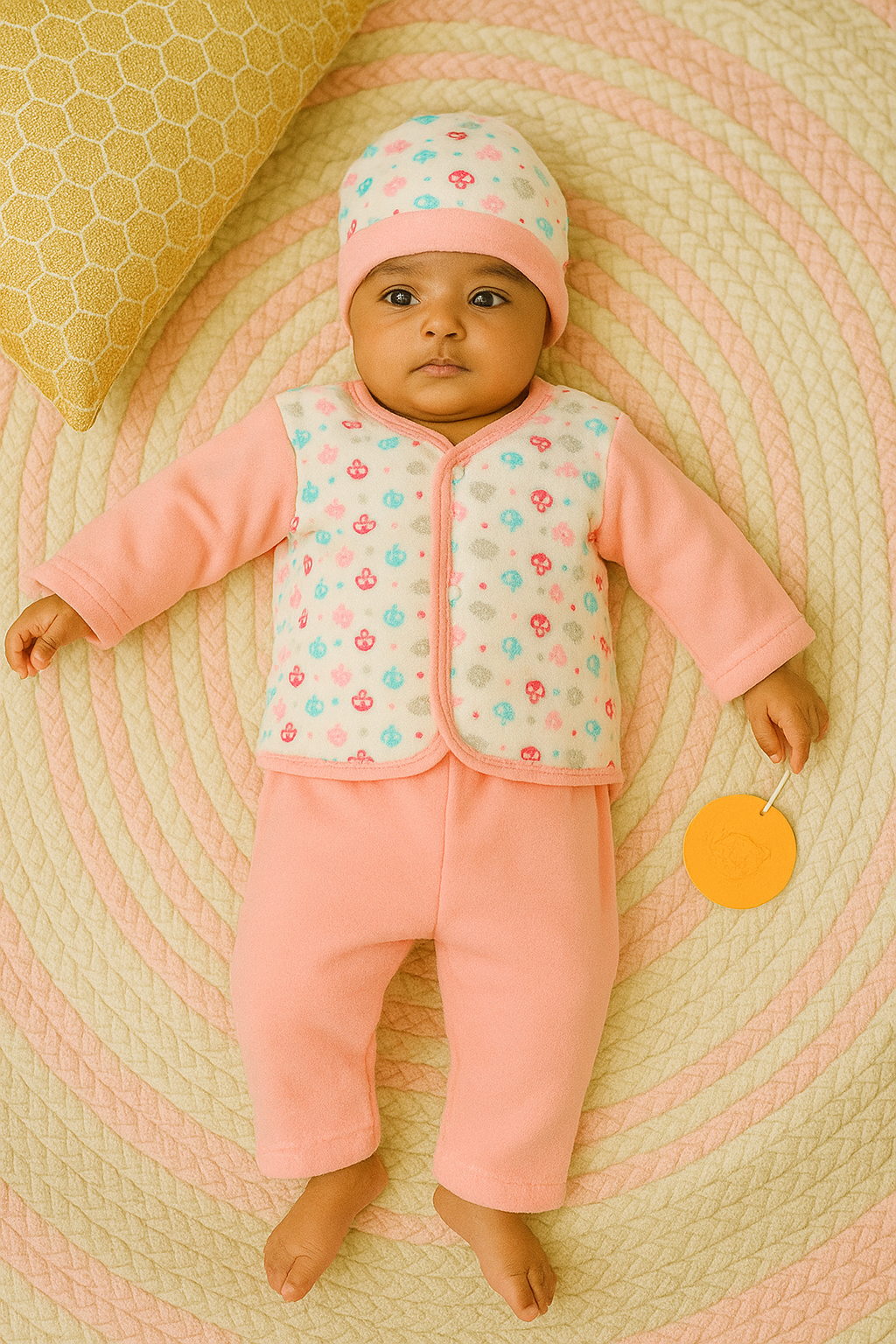 Each 4-Piece Set Includes: A matching hat, long-sleeve top, heart-print vest, and pants.
